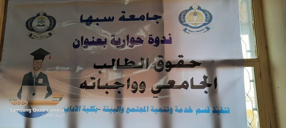 عقد قسم خدمة وتنمية المجتمع والبيئة بكلية الآداب صباح الخميس الموافق (20-1-2022م) في قاعة المطالعة مكتبة الكلية ندوة حوارية حول ( حقوق الطالب الجامعي وواجباته) برعاية مركز تنمية المجتمع والبيئة بالجامعة ، وقام بتقديمها