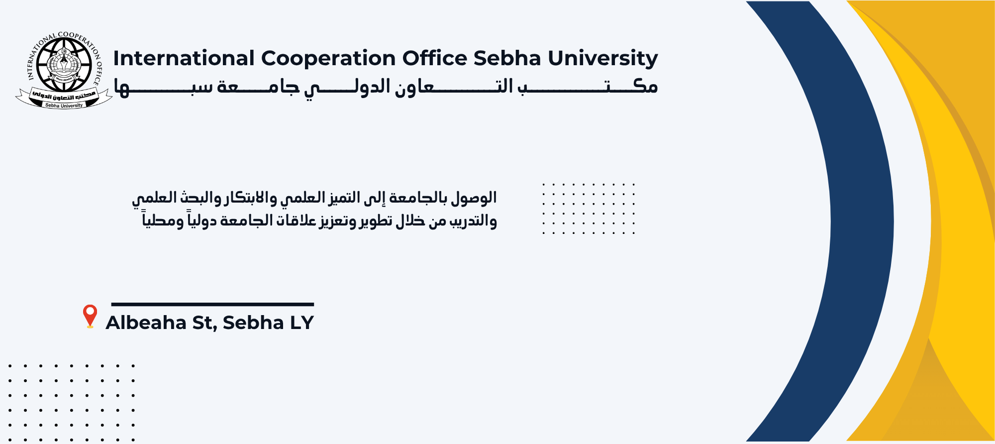 يسعى مكتب التعاون الدولي والعلاقات الثقافية بجامعة سبها الى بناء وتعزيز أواصر التواصل المعرفي والثقافي مع أرقى الجامعات والمراكز البحثية على الصعيد المحلي والدولي وذلك من خلال إبرام الاتفاقيات ومذكرات التفاهم والشراكات الاستراتيجية ، كما يهدف المكتب إلى توسيع نطاق التعاون الأكاديمي والبحثي، مما يساهم في رفع مستوى الجامعة وتمكينها من تحقيق الريادة في مجالات البحث العلمي والابتكار والتدريب والتنمية المستدامة.