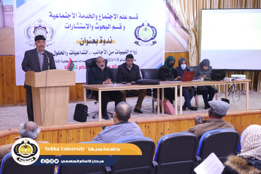 في إطار الاهتمام بالقضايا الاجتماعية؛ نظم قسم علم الاجتماع والخدمة الاجتماعية بالتعاون مع قسم البحوث والاستشارات العلمية بكلية الآداب ندوة بعنوان : ( زواج الليبيات من الأجانب – التداعيات والحلول) صباح اليوم الأحد الموافق 8/1/ 2023 م، بمسرح الكلية، وشمل البرنامج العام كلمة السيد عميد كلية الآداب ( د. أبوبكر المبروك)، وكلمة رئيس قسم علم الاجتماع والخدمة الاجتماعية ( د. يوسف الصيد)، وكلمة الشؤون الاجتماعية، والهلال الأحمر الليبي، وكلمة الليبيات المتزوجات من الأجانب .