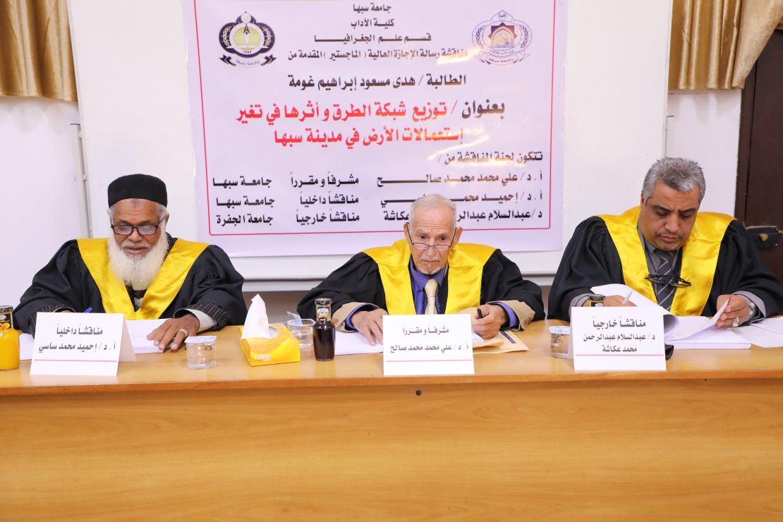 شهد قسم الجغرافيا ” بكلية الآداب مناقشة رسالة علمية موسومة بعنوان : ( توزيع الشبكات وأثرها في تغير استعمالات الأرض في مدينة سبها)، وذلك يوم الأحد (الموافق 5\2\2023م) في تمام الساعة العاشرة صباحاً، بمدرج الدراسات العليا بكلية العلوم .
