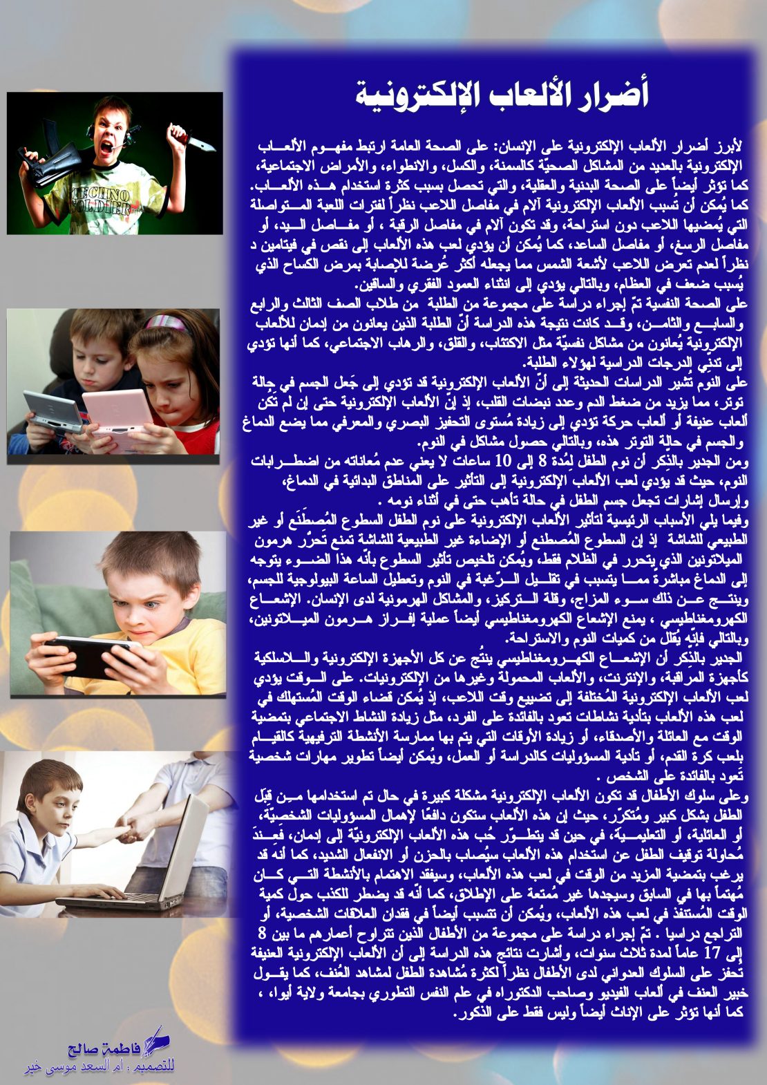 لأبرز أضرار الألعاب الإلكترونية على الإنسان: على الصحة العامة ارتبط مفهوم الألعاب الإلكترونية بالعديد من المشاكل الصحيَّة كالسمنة، والكسل، والانطواء، والأمراض الاجتماعية، كما تؤثر أيضاً على الصحة البدنية والعقلية، والتي تحصل بسبب كثرة استخدام هذه الألعاب.