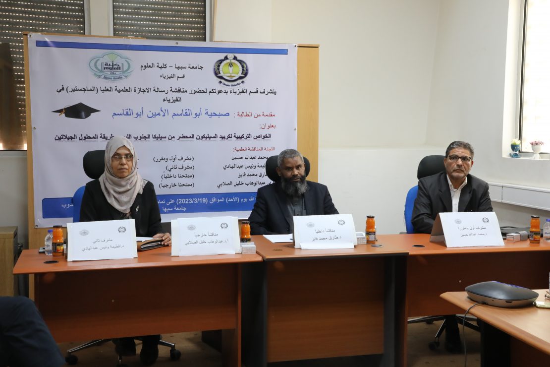 شهد قسم علم الفيزياء بكلية العلوم بالجامعة، مناقشة رسالة علمية لمنح درجة الإجازة العالية (الماجستير) عنوانها : (الخواص التركيبية لكربيد السيليكون المحضر من سيليكا الجنوب الليبي بطريقة المحلول الجيلاتيني)، مقدمة من الطالبة: صبحية أبوالقاسم الأمين أبو القاسم، وذلك يوم الأحد الموافق (2023/3/19م )، في تمام الساعة الثانية عشرة ظهراً، بمركز خدمات الحاسوب .