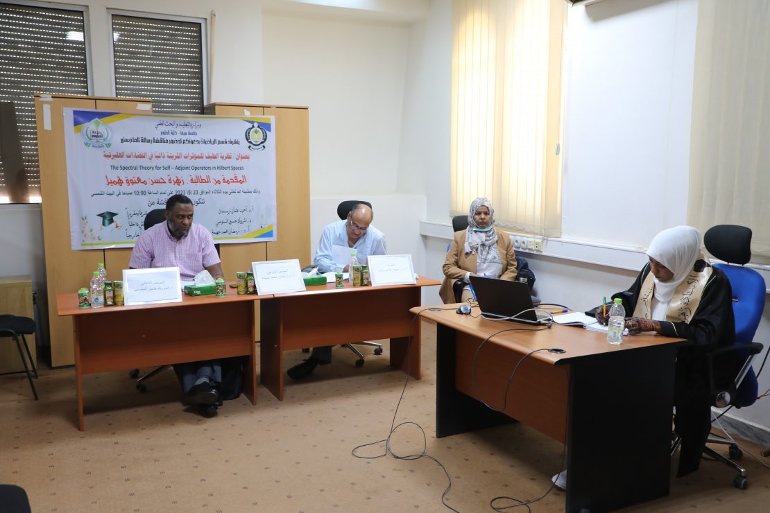 شهد قسم الرياضيات بكلية العلوم بالجامعة، مناقشة رسالة علمية موسومة بعنوان: (نظرية الطيف للمؤثرات القرينة ذاتياً في الفضاءات الهلبرتية)، مقدمة من الطالبة: زهرة حسن معتوق هميل، وذلك يوم الثلاثاء الموافق 23/5/ 2023 م، في تمام الساعة العاشرة صباحاً، في مركز خدمات الحاسوب بالجامعة .