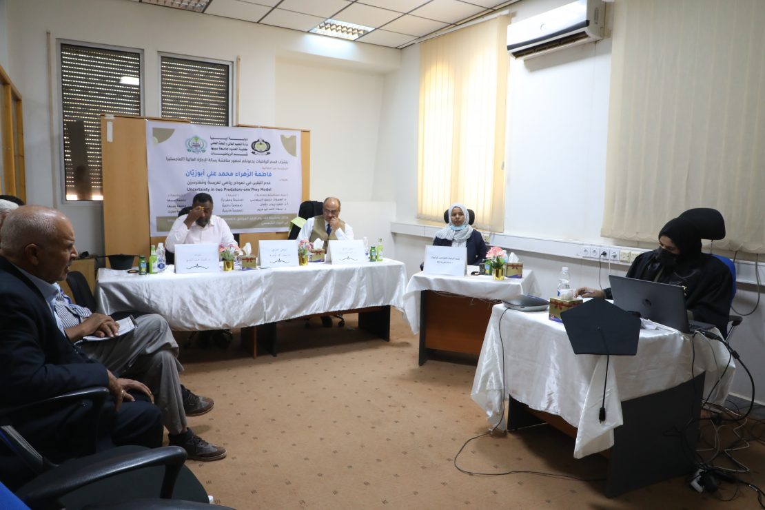 شهد قسم الرياضيات في كلية العلوم بالجامعة، مناقشة رسالة علمية موسومة بعنوان : (عدم اليقين في نموذج رياضي لفريسة ومفترسين )