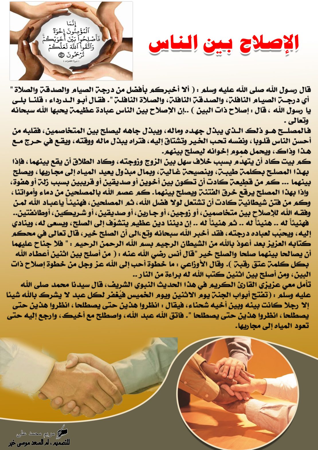إن الإصلاح بين الناس عبادة عظيمة يحبها الله سبحانه وتعالى ……