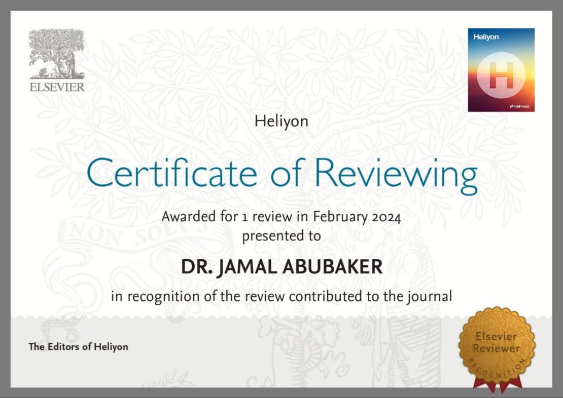 جامعة سبها : الدكتور جمال عبدالله يحصل على شهادة شكر وتقدير لمشاركته في تقييم أحد البحوث العلمية المقدمة للنشر في مجلة “Heliyon” التابعة لوكالة النشر العالمية السفير “Elsevier”.