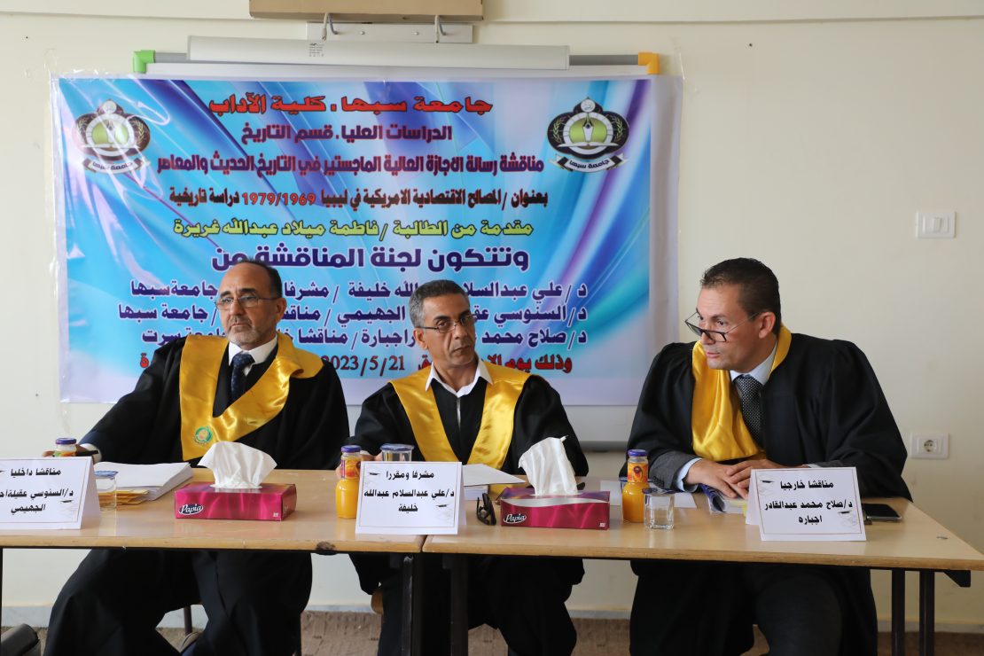 شهد قسم التاريخ بكلية الآداب بالجامعة سبها، مناقشة رسالة علمية في (التاريخ المعاصر والحديث) موسومة بعنوان: (المصالح الاقتصادية الأمريكية في ليبيا 1979\1969 دراسة تاريخية )