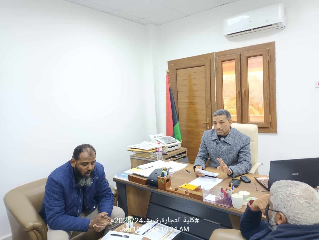 برئاسة السيد د.احمد ابراهيم اسويسي عميد الكلية وبحضور السادة اعضاء المجلس عقد مجلس الكلية بمكتب العميد صباح اليوم الاحد على تمام الساعة 10:00 صباحا اجتماعه العادي (الاول) للعام 2025 م حيث تم فـي الاجتماع مناقشة البنود التالية:-.