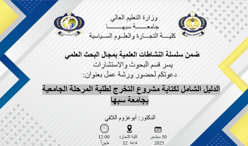 طلبتنا الأعزاء ،،، يا من على عتبات التخرج، وبالأخص من هم في مرحلة كتابة البحوث، لتكون بدايتنا صحيحة وقويّة، فانتم مدعون إلى الحضور والمشاركة في ورشة عمل حول الدليل الشامل لكتابة مشروع التخرج بجامعة سبها ،