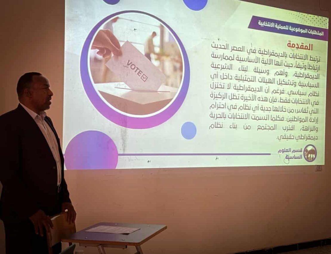 اقيمت صباح اليوم الثلاثاء، الموافق 27 مايو 2025، في قاعة الشهيد أ. علي كارة، ندوة علمية تحت عنوان “مسار العملية الانتخابية في ليبيا: التحديات والفرص”، بتنظيم من قسم العلوم السياسية وبالتعاون مع مركز تنمية وخدمة المجتمع في الجامعة، بحضور السيد د. أحمد إبراهيم اسويسي عميد الكلية، والسيد محمد علي الطاهر عبدو وكيل الكلية، والسيد أ. مصطفى عقيلة أحمد. رئيس قسم العلوم السياسية،والسيـــد د. المبروك بوسبيحة مدير مركز تنمية وخدمة المجتمع. بالإضافــــة إلى عدد كبير من أعضاء هيئة التدريس والطلبــــة بالكلية ، كما شهدت الندوة مشاركة متميزة من الخبراء الأكاديميين بالجامعة وممثلي المؤسسات الانتخابية ووسائل الإعلام / وأ. علي سحب، رئيس قسم الدراسات العليا بكلية الآداب، وأ. رمضان كرنفودة إعلامي وعضو بالمفوضية العليا للانتخابات بسبها، و أ. نافع حسن ميدون رئيس قسم البحوث والندوات بالجامعة، و أ. إدريس بن جويرية إعلامي ومترشح للانتخابات البرلمانية.