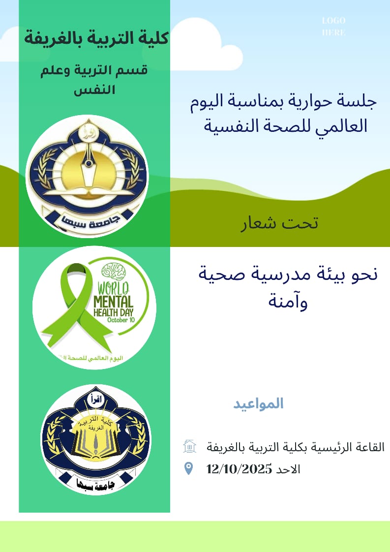 يجري قسم التربية وعلم النفس بكلية التربية الغريفة الاستعدادات لإحياء اليوم العالمي للصحة النفسية خلال شهر أكتوبر القادم 2025 وذلك بإقامة ندوة حوارية تحت شعار ” نحو بيئة مدرسية صحية وآمنة ” سيشارك في فعاليات هذه الجلسة مراقبي التربية والتعليم بالبلديات ومدراء المؤسسات التعليمية بالإضافة الى الاختصاصيين النفسيين والاجتماعيين بالمؤسسات التعليمية العامة والخاصة ، الى جانب طلاب وأعضاء هيئة التدريس بقسم التربية وعلم النفس