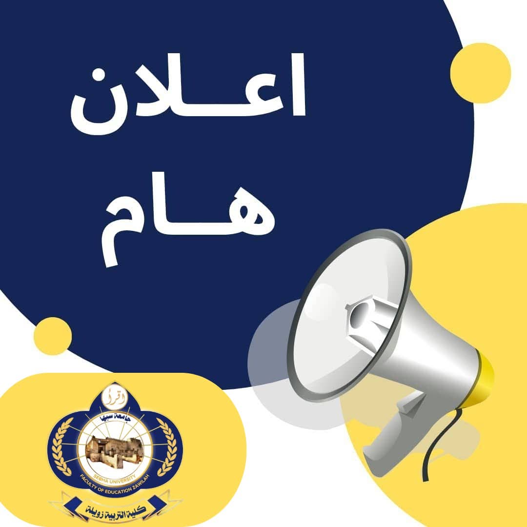 تعلن كلية التربية زويلة – جامعة سبها عن فتح المنظومة الإلكترونية للتسجيل أمام الطلبة من حملة الشهادة الثانوية العامة (الدور الأول والثاني)، والذين لم يتمكنوا من التسجيل في الفترات السابقة .