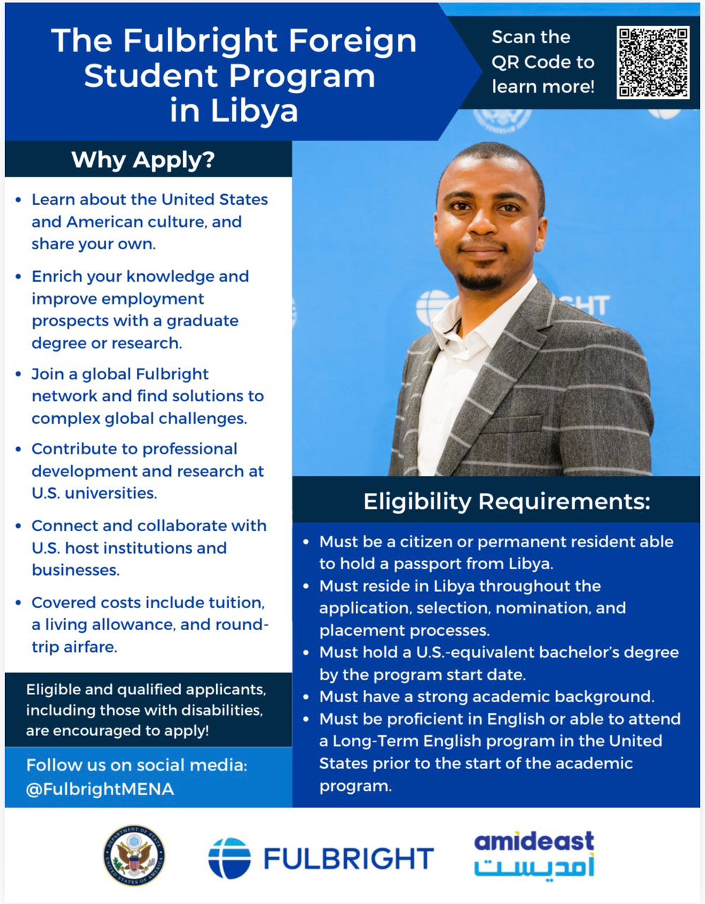 . يمكنكم زيارة موقع فولبرايت ليبيا لمزيدًا من المعلومات من ☜☜☜ هنا ☞☞☞.
