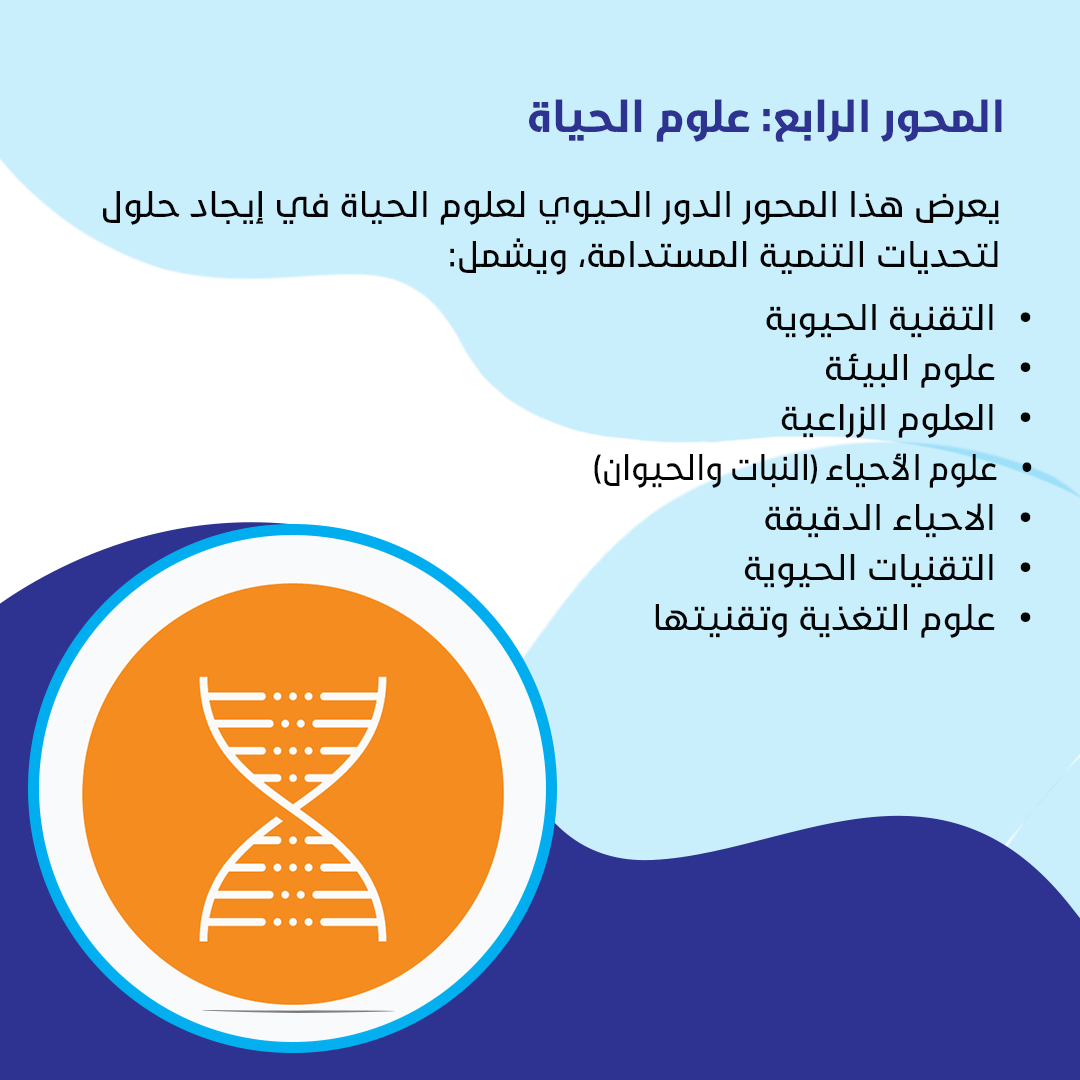 ويشمل هذا المحور (التقنية الحيوية علوم البيئة، العلوم الزراعية، علوم الأحياء (النبات والحيوان)، علوم التغذية وتقنيتها).