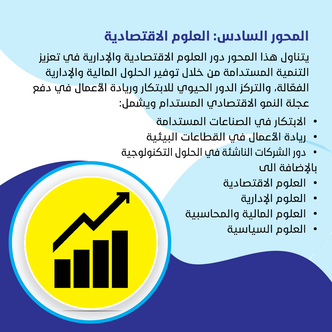 ويشمل هذا المحور (الابتكار في الصناعات المستدامة ، ريادة الأعمال في القطاعات البيئية ، دور الشركات الناشئة في الحلول التكنولوجية ) بالإضافة الي (العلوم الاقتصادية، العلوم الإدارية، العلوم المالية والمحاسبية، العلوم السياسية).