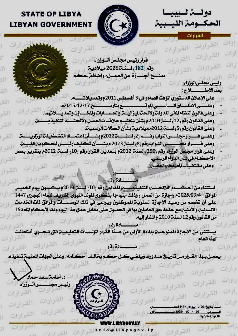 عطلة رسمية يوم الخميس4/9/2025