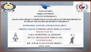 يتناول هذا البحث دراسة مستوى المعرفة والوعي لدى طلاب الطب حول Chronic Fatigue Syndrome (متلازمة التعب المزمن)، وهي حالة صحية مزمنة تتميز بالإرهاق الشديد الذي يستمر لفترة طويلة ولا يتحسن بالراحة.